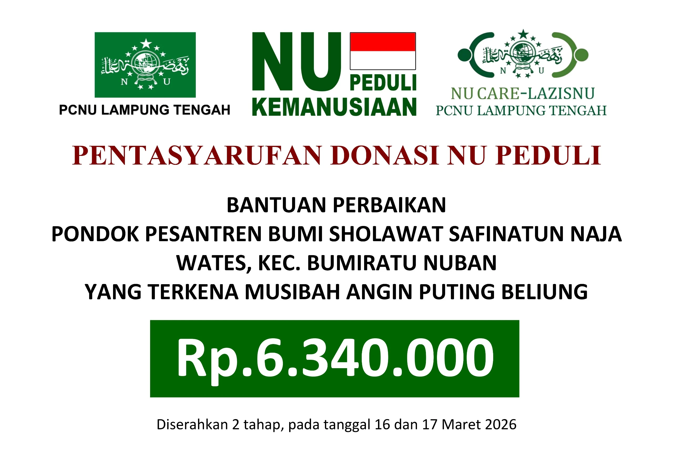 Lampung Tengah, 18 Maret 2026 — Semangat sinergitas antar lembaga dan badan otonom (banom) Nahdlatul Ulama kembali terlihat di Lampung Tengah. NU Care–LAZISNU PCNU Lampung Tengah menyalurkan bantuan sebesar Rp1.000.000 untuk mendukung operasional Posko Mudik Ansor Banser Satkorcab Lampung Tengah dalam momentum Ramadhan 1447 H.